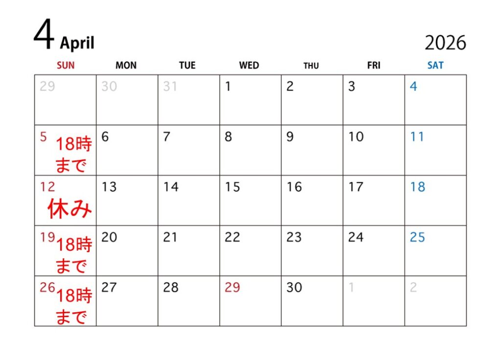 4月の営業のお知らせ 2026年03月30日 4月の営業のお知らせです 12日は研修のためお休みいたします 日曜日のみ 18時までの営業とさせていただきます 尚、祝日は平常通り19時まで営業いたします よろしくおねがいいたします 前の記事へ 一覧へ