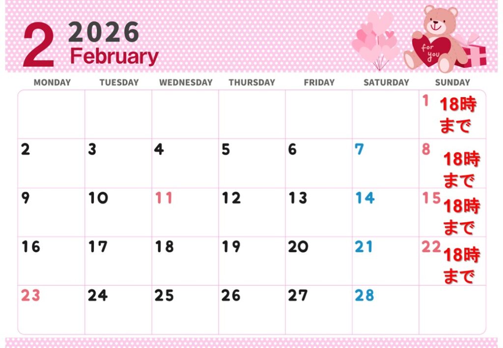 2月の営業のお知らせ 2026年01月10日 2月の営業のお知らせです 2月より日曜日のみ 18時までの営業とさせていただきます 尚、祝日は平常通り19時まで営業いたします よろしくおねがいいたします 前の記事へ 一覧へ 次の記事へ